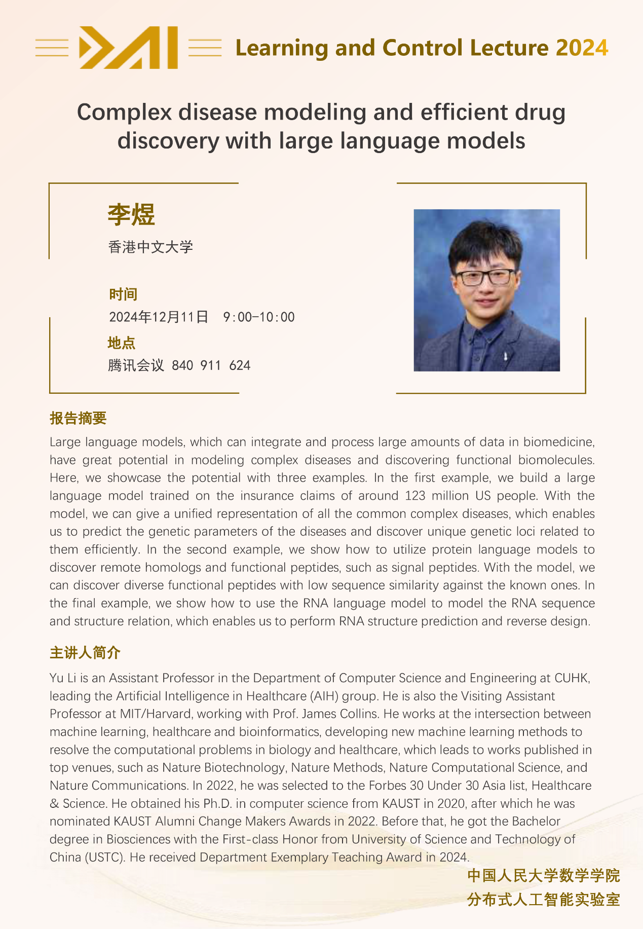 Yu Li is an Assistant Professor in the Department of Computer Science and Engineering at CUHK, leading the Artificial Intelligence in Healthcare (AIH) group. He is also the Visiting Assistant Professor at MIT/Harvard, working with Prof. James Collins. He works at the intersection between machine learning, healthcare and bioinformatics, developing new machine learning methods to resolve the computational problems in biology and healthcare, which leads to works published in top venues, such as Nature Biotechnology, Nature Methods, Nature Computational Science, and Nature Communications. In 2022, he was selected to the Forbes 30 Under 30 Asia list, Healthcare & Science. He obtained his Ph.D. in computer science from KAUST in 2020, after which he was nominated KAUST Alumni Change Makers Awards in 2022. Before that, he got the Bachelor degree in Biosciences with the First-class Honor from University of Science and Technology of China (USTC). He received Department Exemplary Teaching Award in 2024.