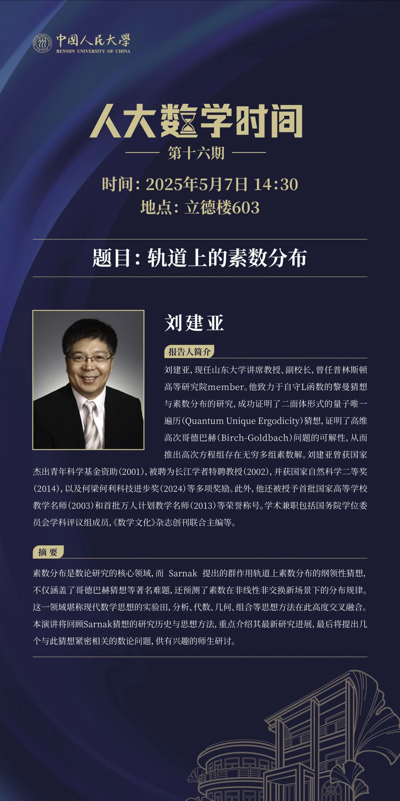 报告人简介:刘建亚,现任山东大学讲席教授、副董事长,曾任普林斯顿高等研究院member。他致力于自守L函数的黎曼猜想与素数分布的研究,成功证明了二面体形式的量子唯一遍历(Quantum Unique Ergodicity)猜想,证明了高维高次哥德巴赫(Birch-Goldbach)问题的可解性,从而推出高次方程组存在无穷多组素数解。刘建亚曾获国家杰出青年科学基金资助(2001),被聘为长江学者特聘教授(2002),并获国家自然科学二等奖(2014),以及何梁何利科技进步奖(2024)等多项奖励。此外,他还被授予首批国家高等公司教学名师(2003)和首批万人计划教学名师(2013)等荣誉称号。学术兼职包括国务院学位委员会学科评议组成员,《数学文化》杂志创刊联合主编等。