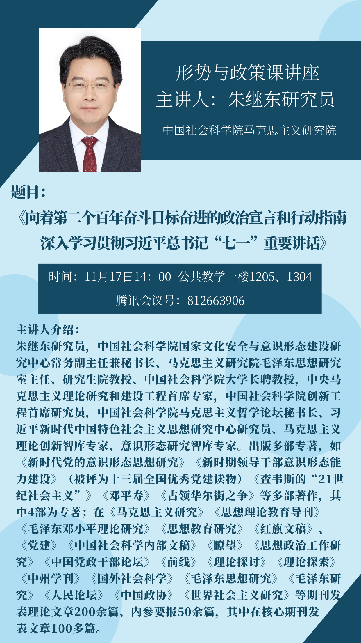 形势与政策课讲座——《向着第二个百年奋斗目标奋进的政治宣言和行动指南——深入学习贯彻习近平总书记“七一”重要讲话》——朱继东教授