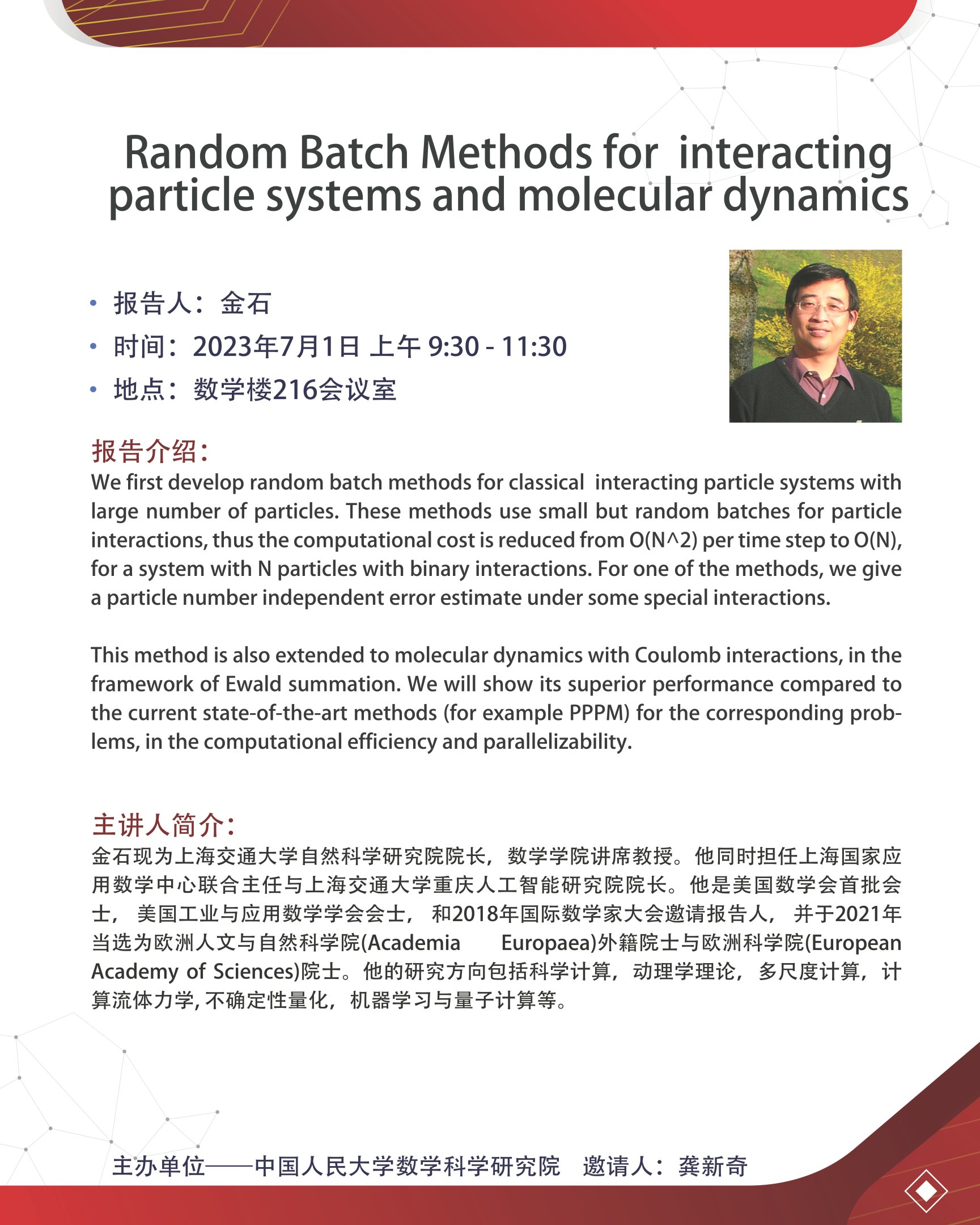 金石教授:Random Batch Methods for interactingparticle systems and molecular dynamics