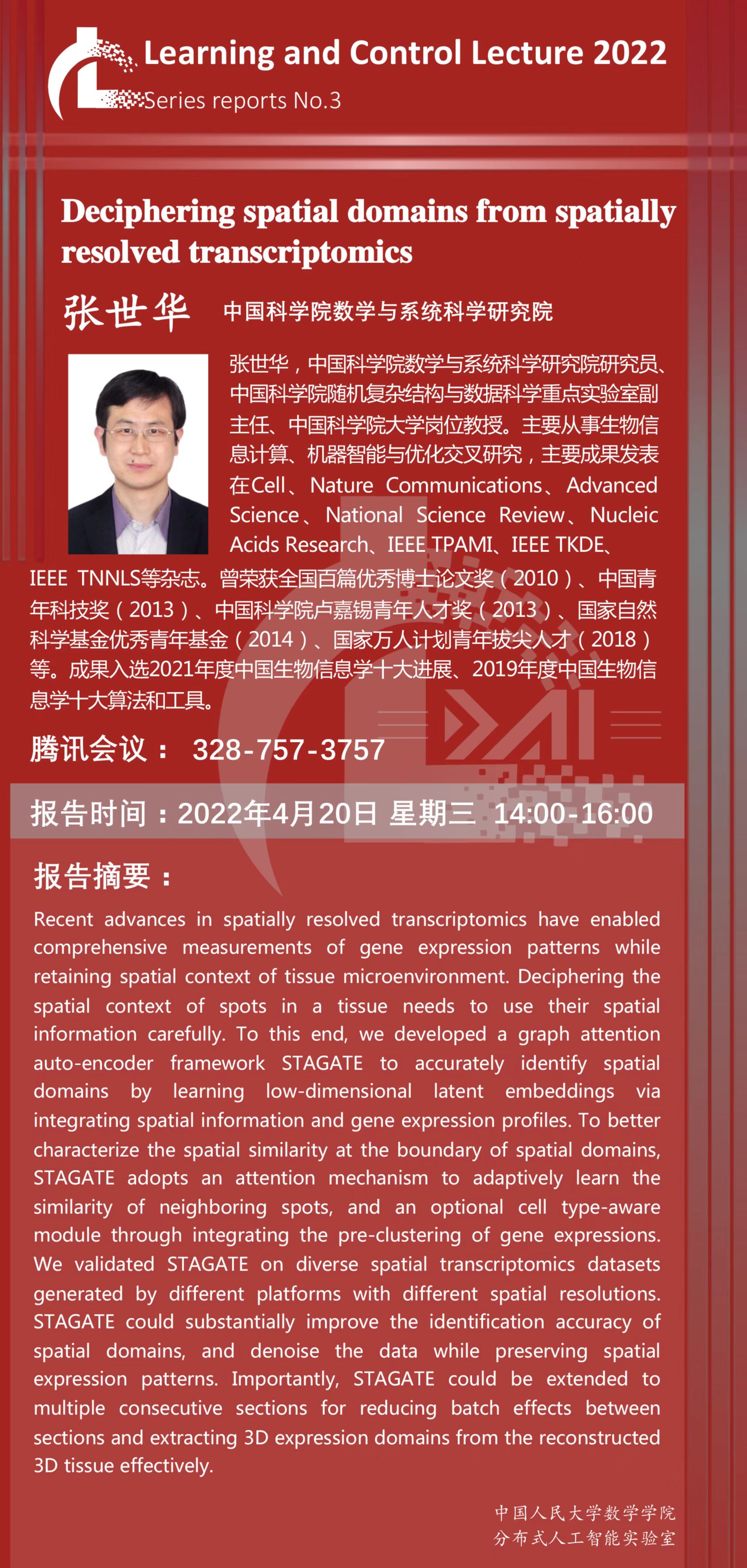 报告人简介:张世华,中国科公司数学与系统科学研究院研究员、中国科公司随机复杂结构与数据科学重点实验室副主任、中国科公司大学岗位教授。主要从事生物信息计算、机器智能与优化交叉研究,主要成果发表在Cell、Nature Communications、Advanced Science、National Science Review、Nucleic Acids Research、IEEE TPAMI、IEEE TKDE、IEEE TNNLS等杂志。曾荣获全国百篇优秀博士论文奖(2010)、中国青年科技奖(2013)、中国科公司卢嘉锡青年人才奖(2013)、国家自然科学基金优秀青年基金(2014)、国家万人计划青年拔尖人才(2018)等。成果入选2021年度中国生物信息学十大进展、2019年度中国生物信息学十大算法和工具。