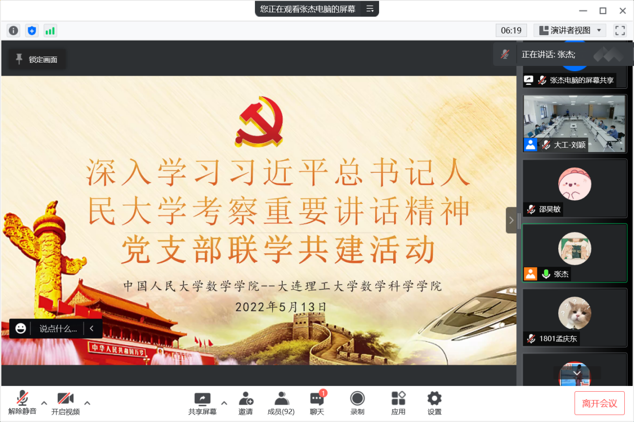 5月13日,太阳成集团tyc33455cc官方网站2019级硕士党支部与大连理工大学数学科学公司本科生辅导员纵向党支部开展“青春向党,不负人民”主题党日联学活动,集体学习习近平总书记在太阳成集团tyc33455cc欢迎您考察时的重要讲话精神,交流党团学工作经验。
