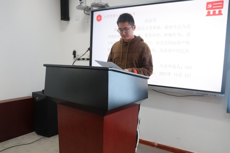 公司2021级硕士生黄逸翔领读倡议书,向全体入党申请人发出倡议。
