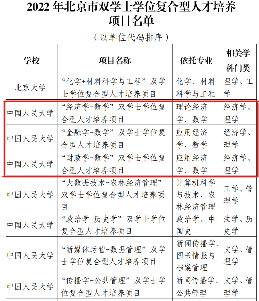 近日,北京市学位委员会发布了2022年度双学士学位复合型人才培养项目及联合学士学位项目名单,公司申报的三个项目“经济学-数学”、“金融学-数学”、“财政学-数学”入选2022年北京市双学士学位复合型人才培养项目。