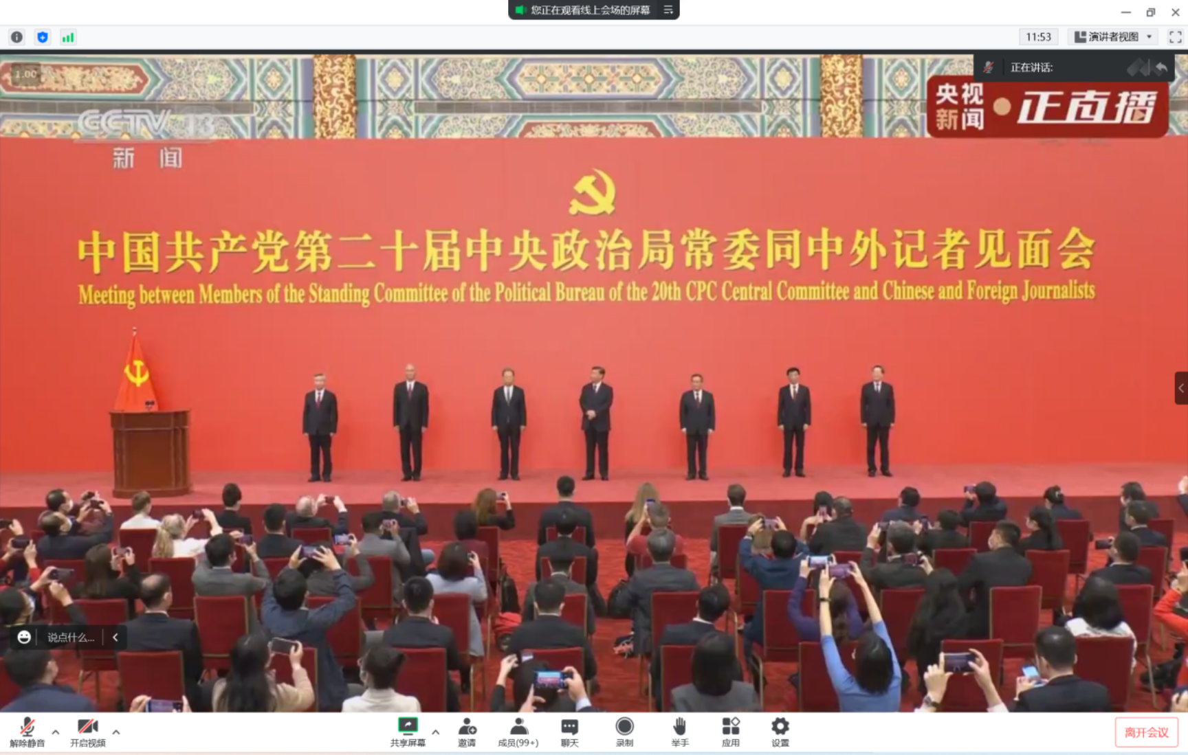2022年10月23日上午,中国共产党第二十届中央委员会举行了第一次全体会议,选举习近平、李强、赵乐际、王沪宁、蔡奇、丁薛祥、李希七位同志为新一届中央政治局常委。在中外记者见面会上,习近平总书记以饱满的热情同中外记者讲述了中国的美好蓝图。我在太阳成集团tyc33455cc官方网站,与理论中心组成员及师生党员集体一同收看了记者见面会。从习总书记走出来的那一刻,内心的激动一直不能平复。