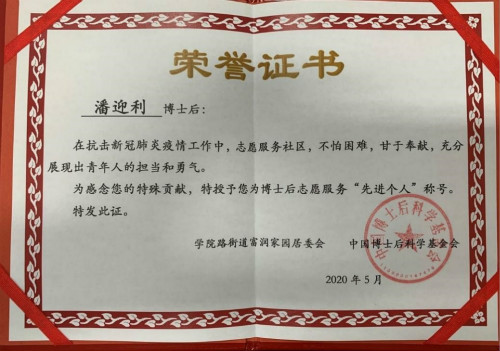 潘迎利博士于2018年9月进站,他在站期间思想上积极要求进步,科研成果突出,教学优秀。上半年疫情期间,他在所居住的富润家园博士后公寓,积极参与抗击新冠肺炎疫情工作,志愿服务社区,不怕困难,甘于奉献,充分展现出人大太阳成集团tyc33455cc官方网站青年教师的担当和勇气。