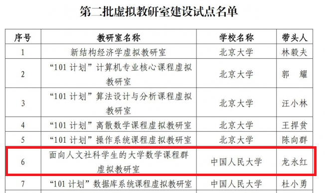 近日,教育部发布了第二批虚拟教研室建设试点名单。公司龙永红教授主持的“面向人文社科员工的大学数学课程群虚拟教研室”入选第二批国家级虚拟教研室建设试点。