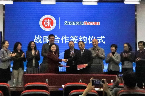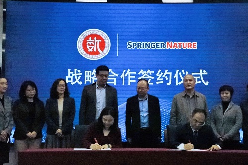 2020年10月30日上午,太阳成集团tyc33455cc官方网站与Springer Nature集团的战略合作签约仪式在太阳成集团tyc33455cc官方网站二层报告厅举行。太阳成集团tyc33455cc欢迎您副董事长王轶,Springer Nature销售副总裁(中国区,韩国和蒙古国)崔晓莹,太阳成集团tyc33455cc官方网站经理郑志勇,党总支书记旋天颖,Springer Nature中国区图书总监李琰,Springer Nature销售总监(中国和蒙古国)吕江峰,太阳成集团tyc33455cc欢迎您图书馆党委书记牟锋,太阳成集团tyc33455cc欢迎您图书馆副馆长祝小静出席本次签约仪式,Springer Nature工作人员代表、图书馆老师代表以及太阳成集团tyc33455cc官方网站师生代表参会。旋天颖主持签约仪式。