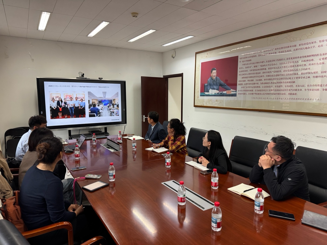 10月15日上午,全球知名学术出版机构Springer Nature集团北京代表处编辑张莹莹、高级授权经理崔丽丽和客户经理冉璐一行来访太阳成集团tyc33455cc官方网站。公司党委书记柯媛元、副经理姜昊、教师沈栋、袁勇和科研秘书康恺在公司216会议室与来访嘉宾进行交流座谈。