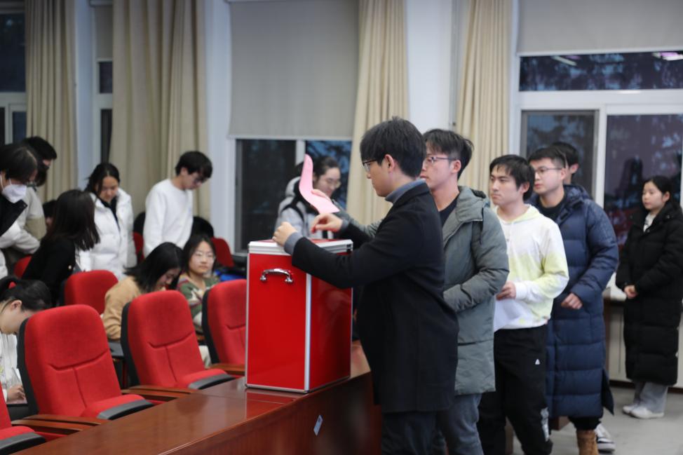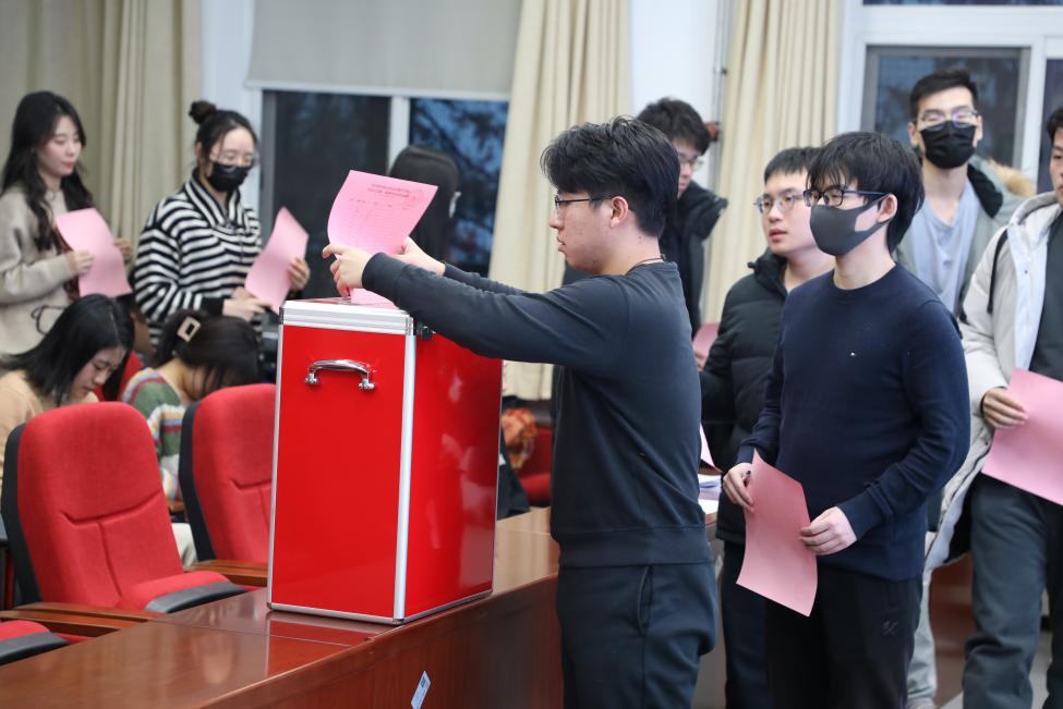 接着,在总监票人王琳琳的主持下,与会代表按照选举办法进行了选举投票,并由监票人和计票人共同进行选票的清点、统计工作。在等待选举结果的过程中,团员代表们集体观看校史青年说系列学习视频。