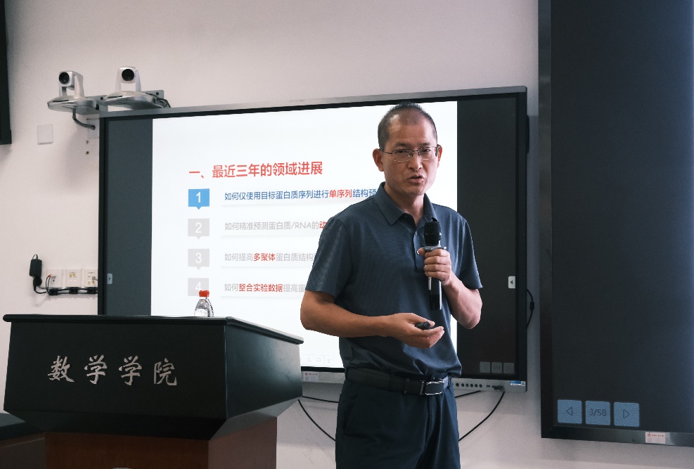龚新奇教授带来了题为《Alphafold时代的蛋白质计算》的报告,详细介绍了当前蛋白质计算的四类前沿问题,包括孤儿蛋白、动态、超大复合物和干湿结合等,阐释了数学原理和深度学习技术大幅提高蛋白质计算准确度的可能性,展示了数学、生物和计算相互交叉研究方面的巨大潜力。