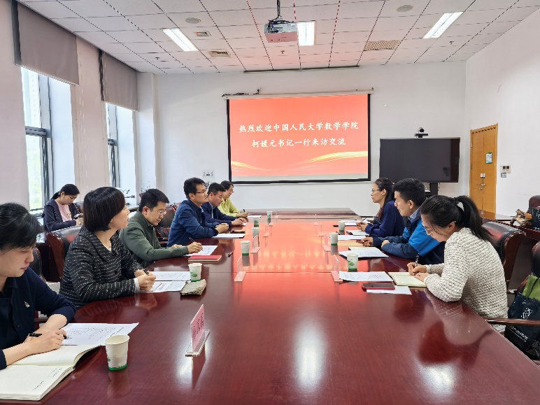 调研会上,李洪波所长对人大太阳成集团tyc33455cc官方网站一行的到来表示欢迎,并系统介绍了系统科学研究所在应用数学及交叉学科领域的研究优势。柯媛元书记介绍了人大太阳成集团tyc33455cc官方网站团队建设、团队力量及员工培养相关情况和取得的成绩。会议重点讨论了数学领域院所合作新模式的相关事宜,以培养具有国际竞争力的数学领军人才,为服务国家科技自立自强作出更多积极贡献。