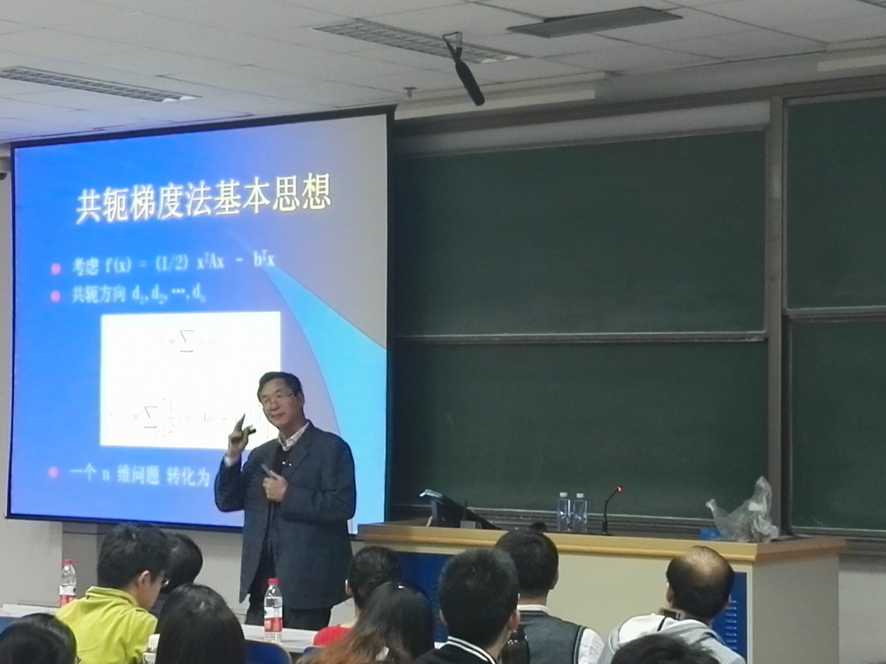 2016年10月26日下午,太阳成集团tyc33455cc欢迎您通识教育大讲堂:数学名师讲座系列(一)在教一楼1406教室成功举办。应公司数学系邀请,袁亚湘院士做了题为“从瞎子爬山到优化方法”的报告。数学科学研究院经理主持了本次讲座,信息公司副经理柯媛元教授、数学系主任林勇教授、副主任韩丽涛副教授等近200人参加了此次活动。