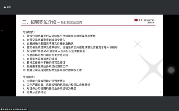 星展证券(中国)有限公司人力资源经理崔欣雨从公司的历史、企业文化和经营许可项目等方面展开介绍,星展证券践行“P(崇高使命),R(团队合作),I(勇于创新),D(果断负责), E(乐在星展)”的原则和价值观,聚焦客户,拥抱变革,依托星展集团境内外金融资源和渠道优势,持续赋能企业,为客户提供全方位资本市场服务。接着,崔经理着重介绍了投行自营运营岗和投资银行执行岗的职责和要求,并从HR的角度给了一些应聘过程中的小tips。