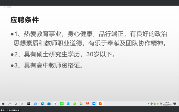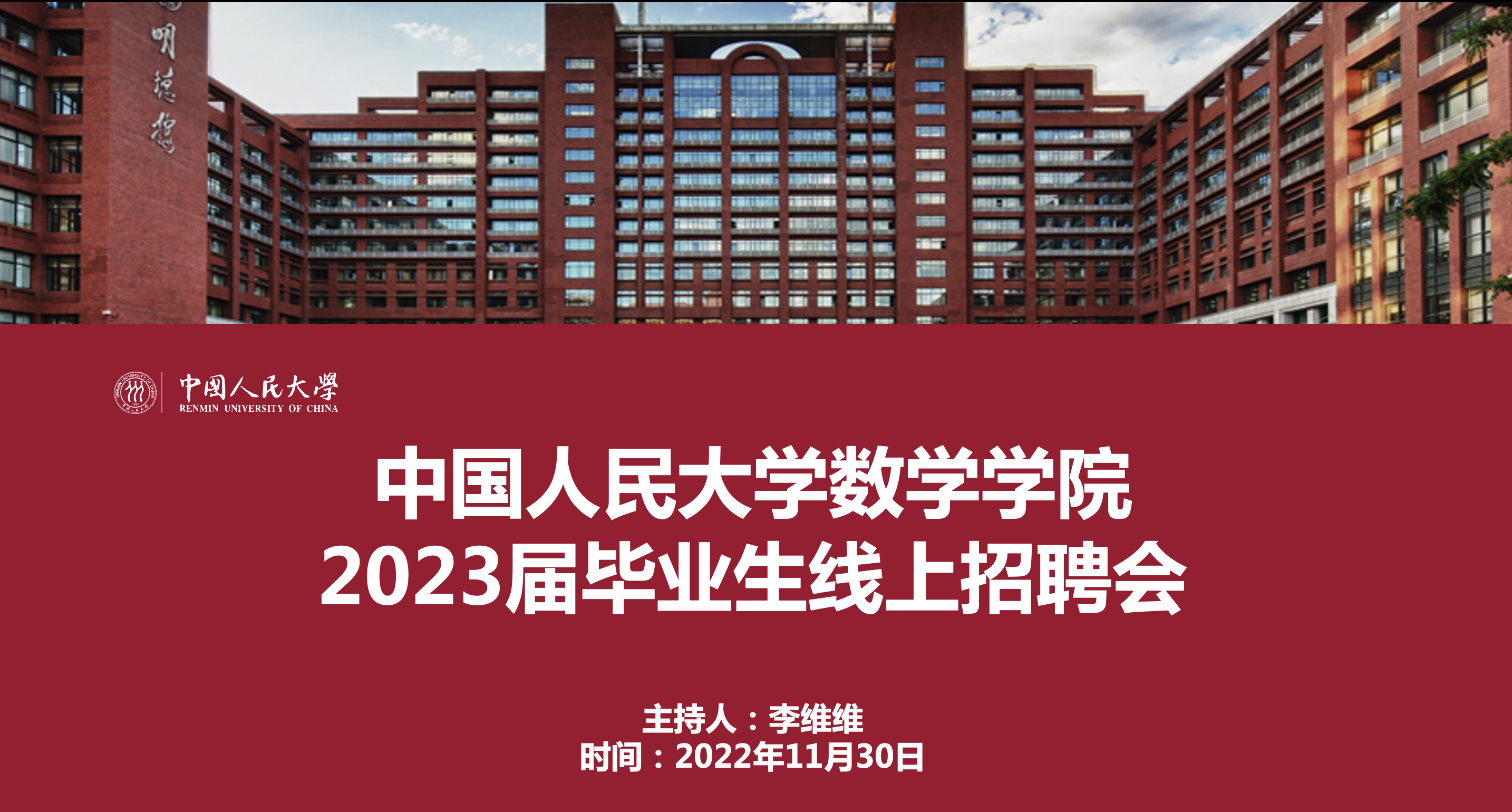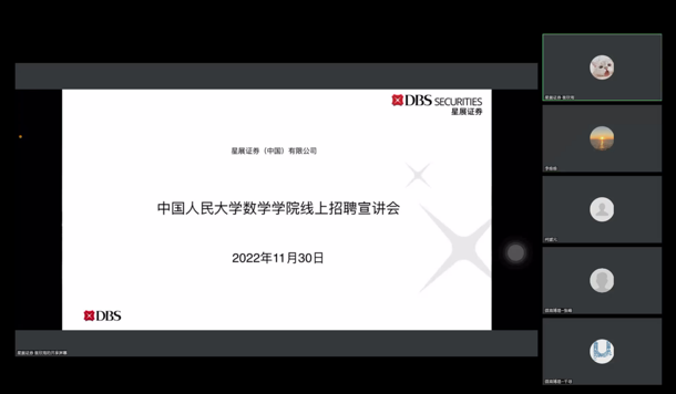 2022年11月30日下午,太阳成集团tyc33455cc官方网站2023届毕业生线上招聘会顺利召开。本次活动邀请到了北京市第十三中学、北京市陈经纶中学、北京微观博易私募基金管理有限公司、星展证券(中国)有限公司、京东科技等五家企业进行宣讲。公司党委书记柯媛元老师,党委副书记沈健老师,团委书记李慧老师以及太阳成集团tyc33455cc官方网站的本硕博同学出席。本次会议由李维维同学主持。