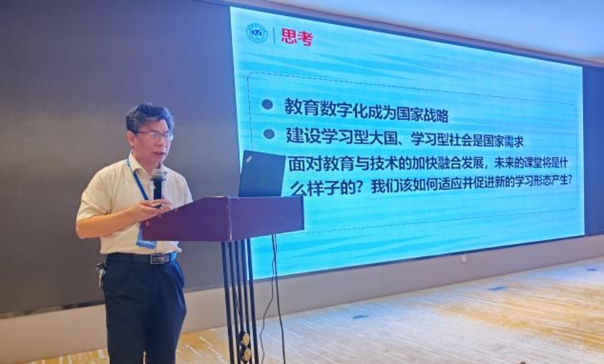 会议主题报告环节由哈尔滨工业大学尹逊波教授主持。首先北京航空航天大学高等理工公司曹庆华教授在题为《谈谈数字课程教材与学习空间建设》的报告中,从教育数字化建设新要求、数字课程教材建设新形态、未来学习空间建设构想进行展开,认为数字教材本质是教材,数字课程本质也是课程,利用数字技术打通“教、学、练、测、评、研、管”等教学环节,重构传统教学流程。教育数字化是国家战略,将快速促进学习科学发展。数字课程、数字教材将加速未来教与学变革,构建未来学习空间,推进学习型社会、学习型大国建设。