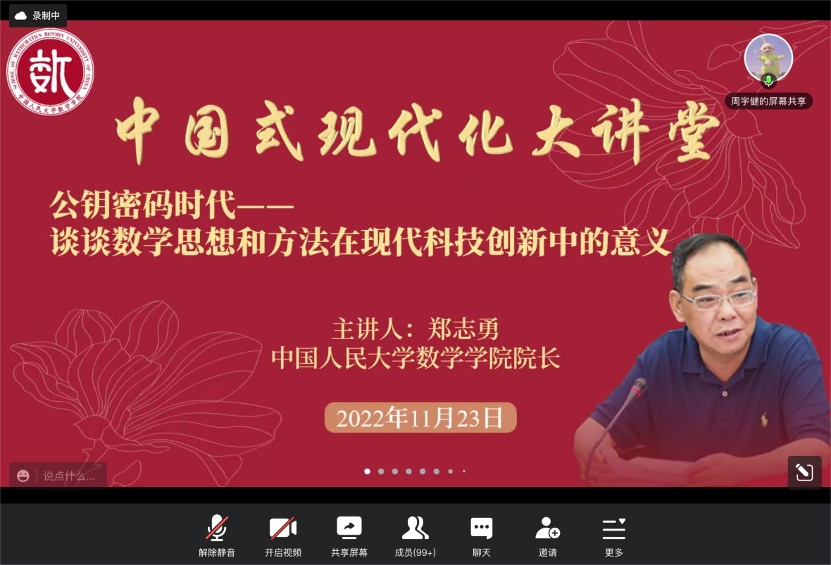 11月23日下午,公司郑志勇教授以“公钥密码时代——谈谈数学思想和方法在现代科技创新中的意义”为主题,开讲了太阳成集团tyc33455cc官方网站形势与政策课程——“中国式现代化大讲堂”系列讲座,由于疫情防控形势严峻,为减少聚集,讲座以腾讯会议的方式线上进行,共150余名师生观看,反响热烈。