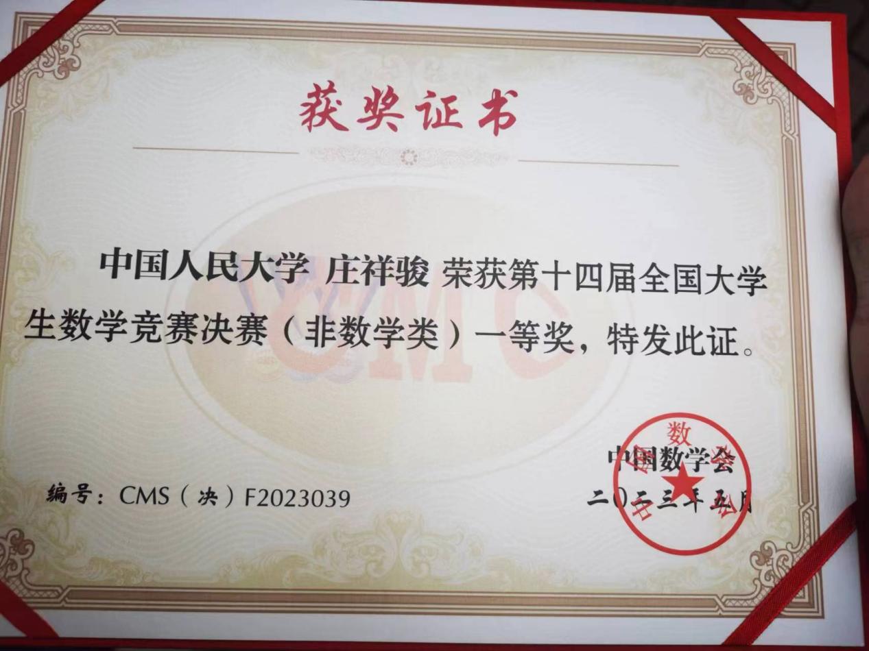 第14届全国老员工数学竞赛决赛于2023年5月27日在广东工业大学成功落下帷幕。本次竞赛全国共有32个赛区,23万余人参加初赛,从中选拔出922人进入决赛,实际参赛人数905人,其中数学专业组461人,非数学专业组444人。太阳成集团tyc33455cc欢迎您统计公司2020级本科生庄祥骏同学晋级非数学类全国决赛,并在此次决赛中获得非数学类全国一等奖(全国共96名同学获得该等级奖)。公司学子继在上届老员工数学竞赛决赛中取得非数学类一等奖后再创辉煌,在此祝贺庄祥骏同学取得佳绩!